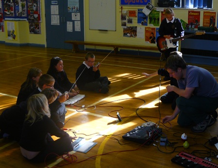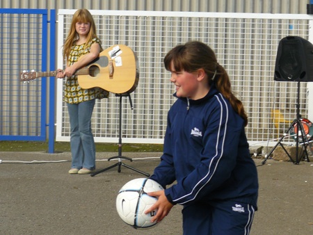 ‘During two sessions on the 15th and 16th of July, children from years 4 and 5 at Barrow Island Community Primary School were asked to compose and perform music based around a game of football. Using a variety of instruments and amplified objects, they were asked to respond to the movements of the ball and the players around the pitch. The majority of the children were non-musicians and were asked to play instruments including: open tuned guitars, a drum machine, an amplified computer keyboard, two large pebbles and a piano. Graphic notation was used to allocate sounds to different areas of the pitch in order to alter the tone of the music over a series of performances. Each group was given the task of devising their own score and organising the players accordingly.’
